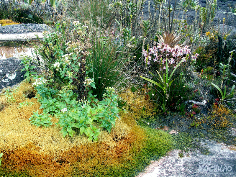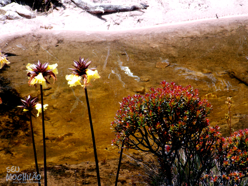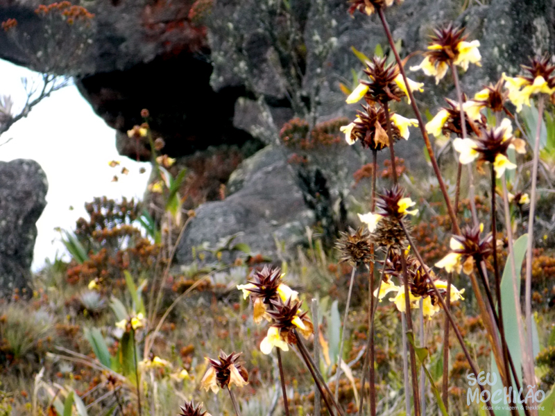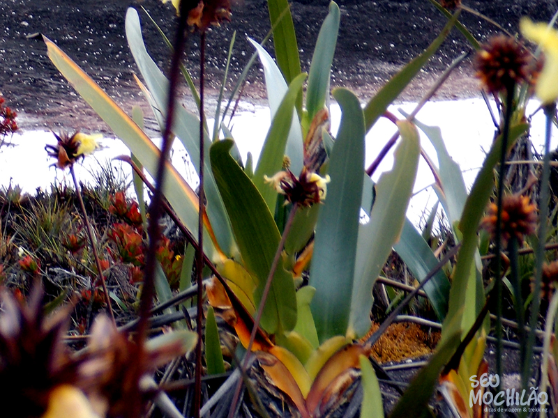Lá, no topo do Monte Roraima, o solo é basicamente feito de rocha, mas as pequenas fendas dão oportunidade para a flora aparecer – e aparece (e florescer) com frequência. E todos os lugares possuem uma plantinha a ser observada. Para se ter ideia, em muitas partes formam verdadeiros jardins. É incrível. Há inúmeras plantas com flores, e o melhor, quase todas são únicas e exclusivas no Monte Roraima. Tem que ir para conhecer, simplesmente.
